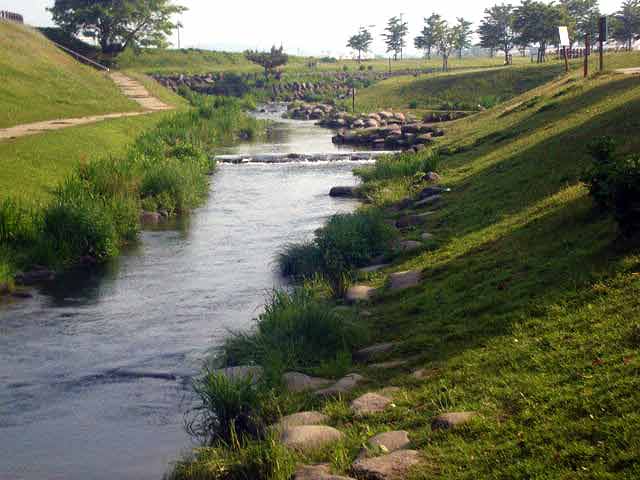 水辺プラザの駐車場の脇には整備された小川があって、朝ここを散歩するととても気持ちがいいところです。 |