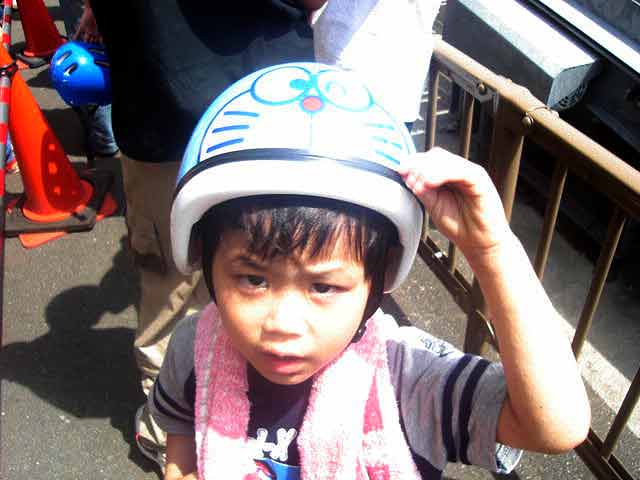 我が家のわんぱく息子もドラエモンのヘルメットで気合十分です!(笑) |