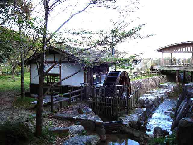 温泉の施設の下には、キャンプ場と公園があり、水車もあります。 |