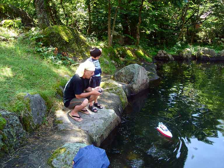 で、キャンプ地の近くの池でボートラジコンをして遊ぶ我が子とコニラさん。