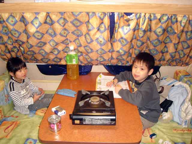 メインのキャンピングカーの装備と比べるとどうしてもトレーラーの設備には不利がありますがこれくらいの料理は作れます! |