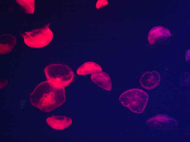 くらげも幻想的な光を浴びると綺麗です。 |