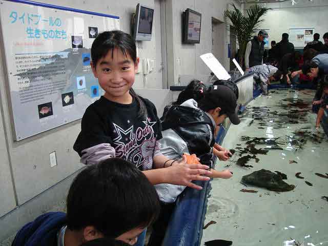 園内には直接魚に触れるところがあって子供達も恐々ながらに触ってました。 |