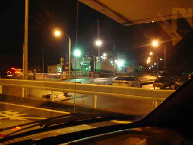 四国・八幡浜行きのフェリーが到着したので、早速、キャンピングカーをフェリーへと走らせます。 |